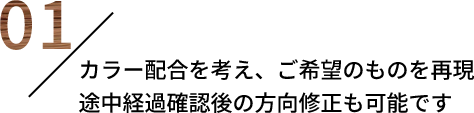 ご希望のカラーがございましたら、雑誌など持ち寄っていただいても構いません。また途中経過確認後の方向修正も可能です。