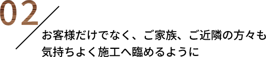 塗装工事は約2週間ものあいだ、お住まいの敷地に職人が出入りすることになります。対応する職人で、お客様からの評価が決まるといっても過言ではありません。